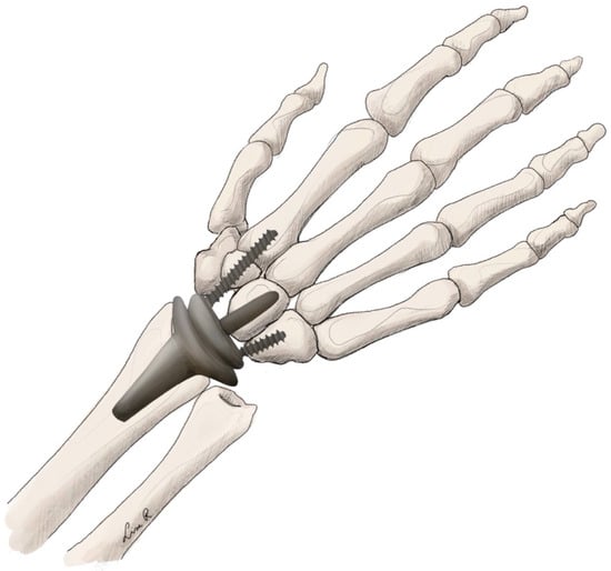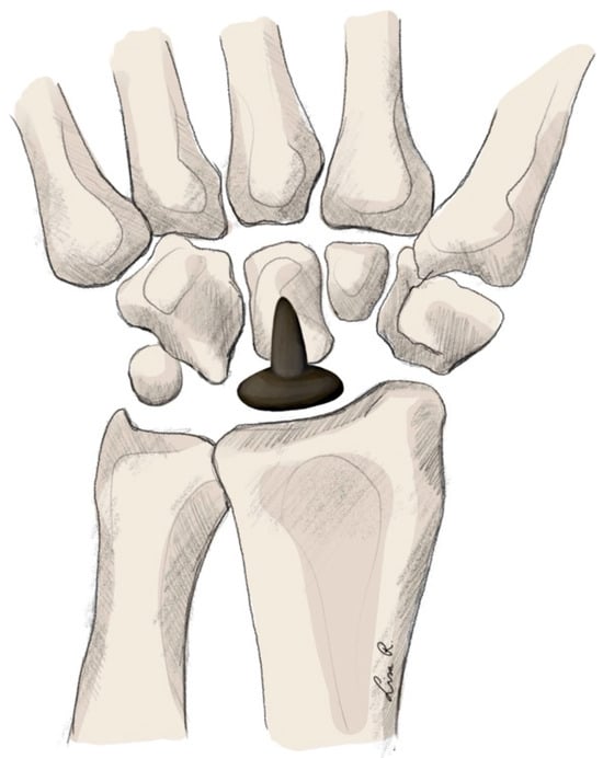 The PCRI is produced using pyrocarbon. The implant features a monobloc design with a slightly tilted head designed to articulate with the lunar fossa of the distal radius []. Firstly, a PRC procedure is performed, in which the scaphoid, lunate, and triquetrum are resected. After this procedure is finished, a minimal osteotomy of the proximal capitate is performed. Following this osteotomy, the stem of the implant is placed in the medullary cavity, and the joint capsule is closed [] (see Figure 7).