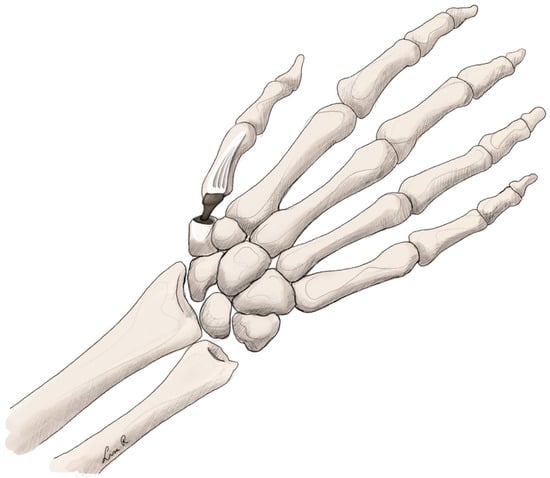 - Thorkildsen, R.D.; Røkkum, M. Trapeziectomy with LRTI or joint replacement for CMC1 arthritis, a randomised controlled trial. J. Plast. Surg. Hand Surg. 2019, 53, 361–369. [Google Scholar] [CrossRef]