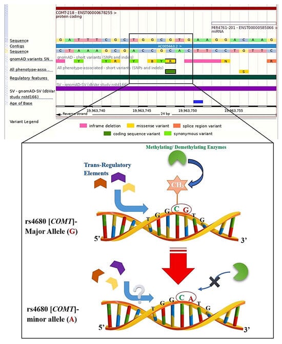 Schematic overview of our basic methodology in finding the CpG-SNPs and then checking them for their type concerning CpG forming or CpG disrupting. In this illustration, we selected rs4680, which is the well-known SNP of the COMT gene, to show the possibilities. As it is clear, in the first step, we searched each SNP of interest (here rs4680) in the Ensembl genome browser and then checked its sequence for being in a CpG site or not; moreover, if a SNP was not in a CpG site, we further checked the minor allele for finding whether it might be a forming CpG site or not. Notably, in this figure, we indicate that methylation-associated enzymes are involved with the methyl group of CpG site (CH3), and this process may have an influence on the binding affinities of trans-regulatory elements, which, in turn, these whole biological processes can potentially be interrupted in the CpG disruption by changing an allele (here, major to minor).