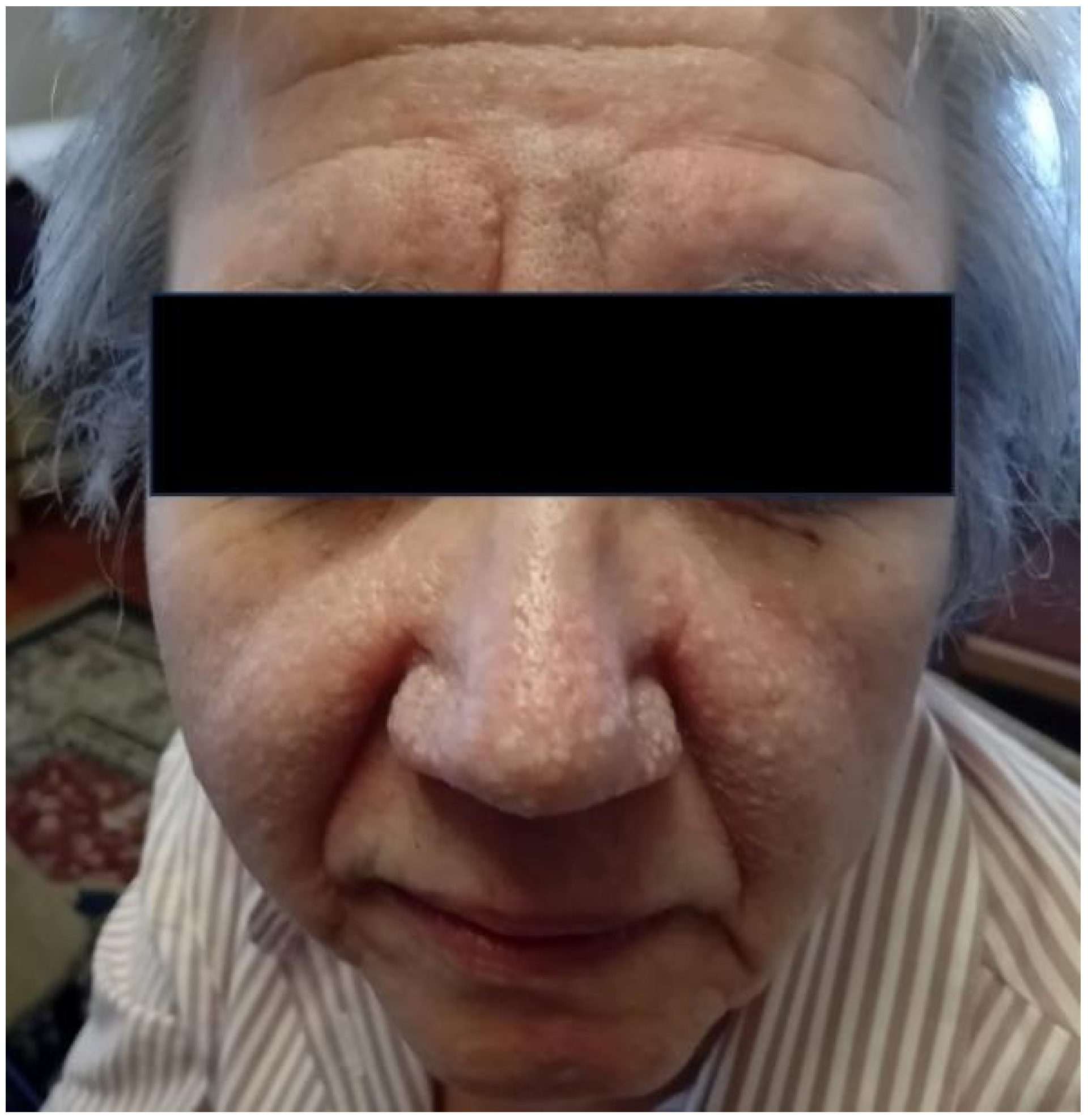 - Lodi, G.; Cannarozzo, G.; Sannino, M.; Pieri, L.; Fusco, I.; Negosanti, F. Fibrofolliculomas in Birt-Hogg-Dubé Syndrome Treated with a CO2 and Dye Laser Combination: A Case Report and Literature Review. Dermatol. Rep. 2025, 17, 10066. [Google Scholar] [CrossRef]