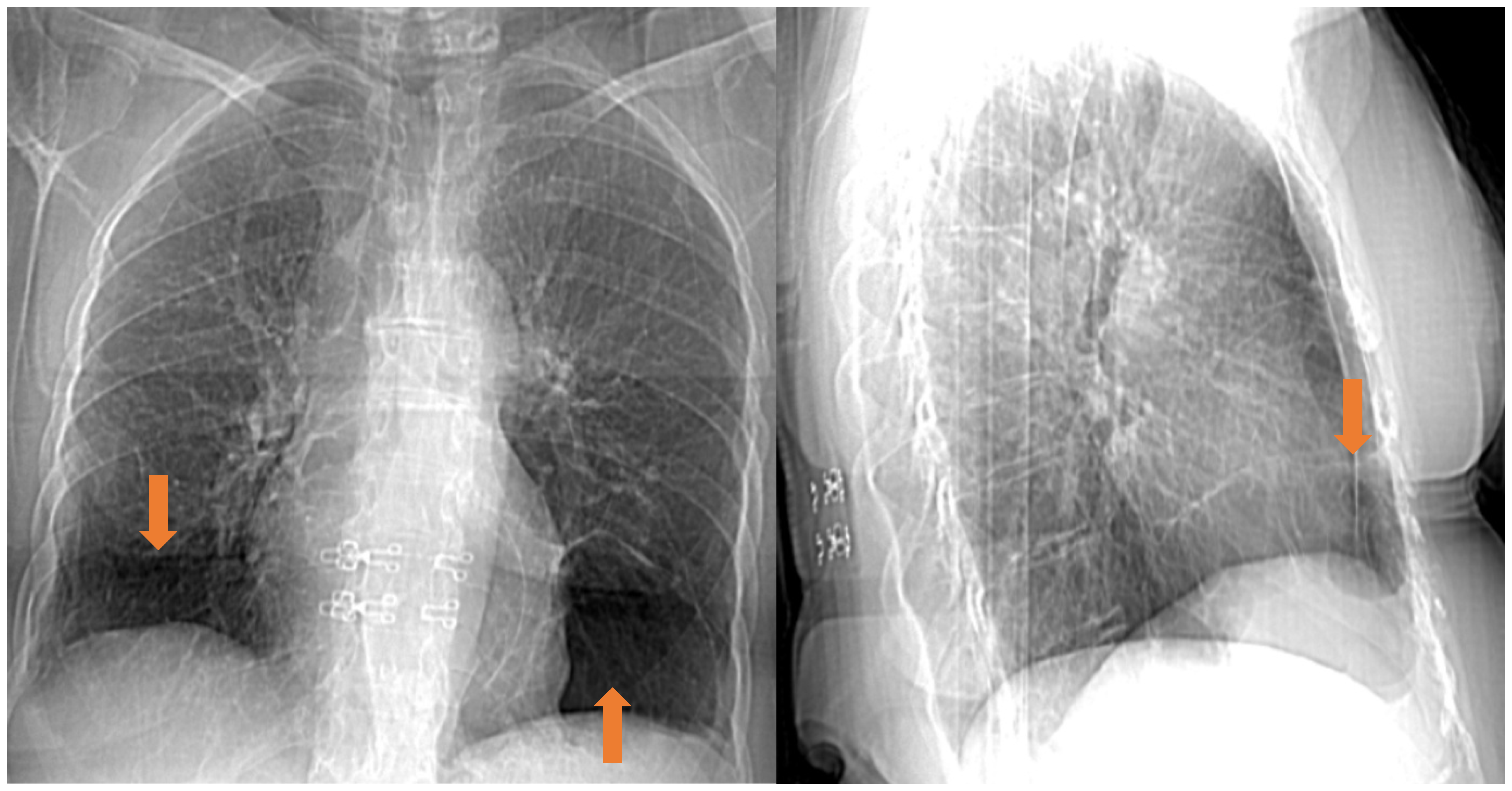 - Multiple bilateral pulmonary cysts, particularly in the lower lung zones.