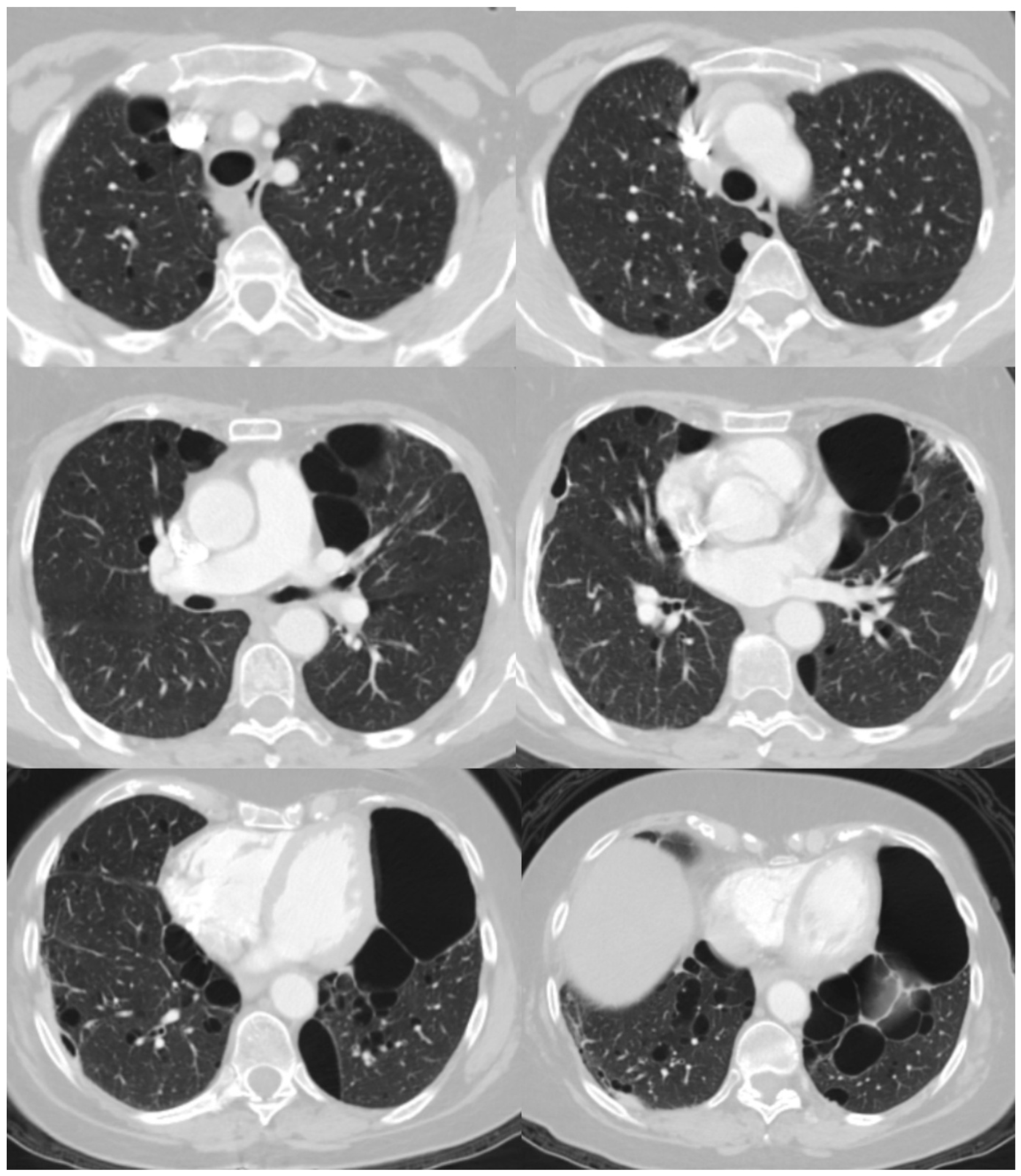 - Basally located bilateral pulmonary cysts with no other known cause.