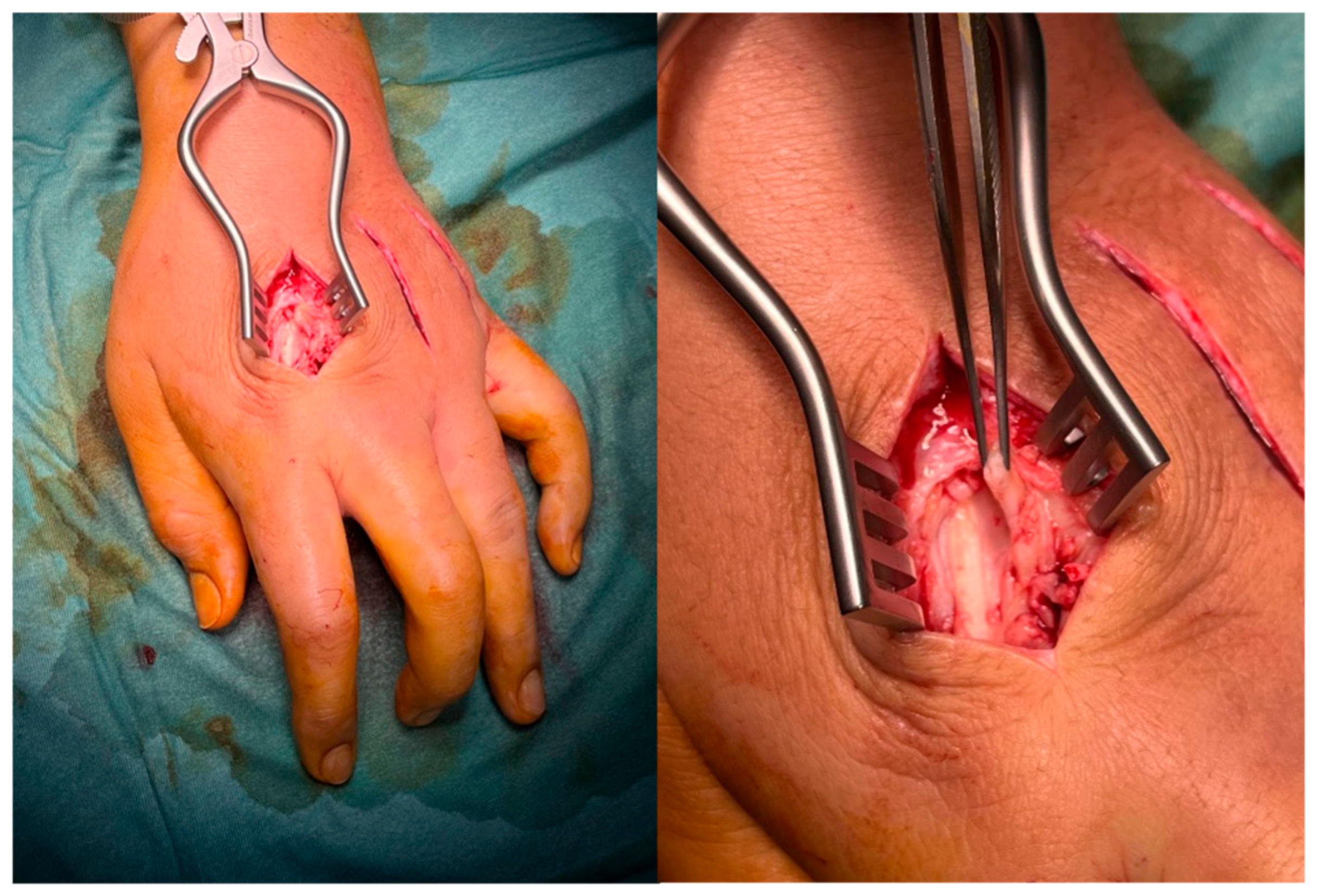 - Redfern, A.B.; Curtis, R.M.; Wilgis, E.F.S. Experience with peritendinous fibrosis of the dorsum of the hand. J. Hand Surg. Am. 1982, 7, 380–383. [Google Scholar] [CrossRef] [PubMed]