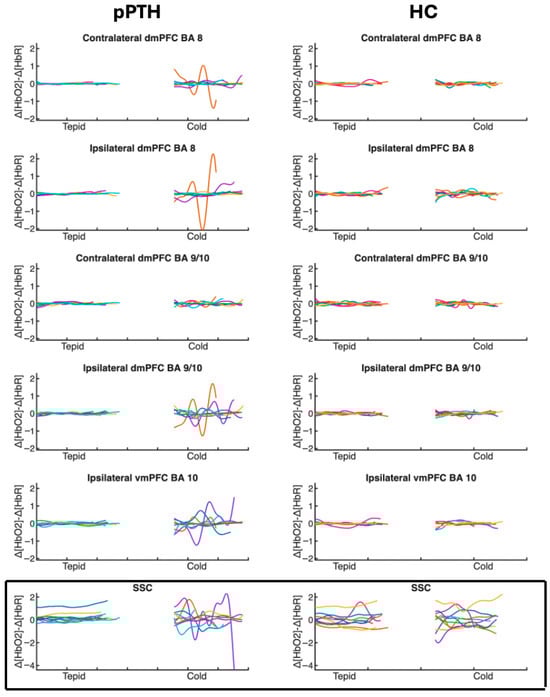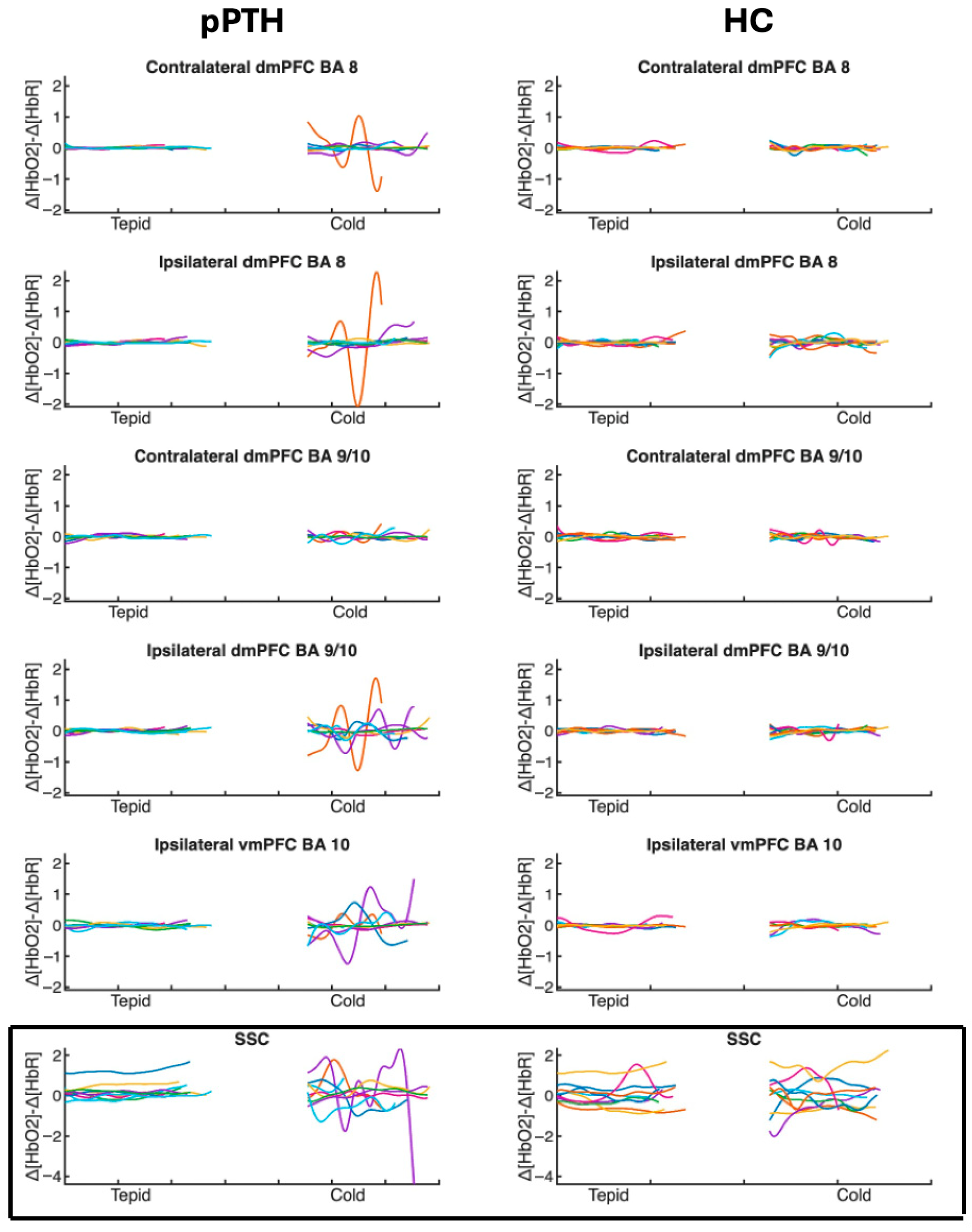 Time course of individual hemodynamic responses for participants with persistent post-traumatic headache and healthy controls during tepid- and cold-water hand immersion. Traces show the time course (x-axis) of individual hemodynamic responses (y-axis) measured as the difference between oxygenated [∆HbO2] and deoxygenated [∆HbO] hemoglobin concentrations at each time point. Each participant’s response is indicated with a different color. Difference values are plotted separately for each optode channel (rows) during the middle 75% of the control task (tepid-water hand immersion) and the experimental cold pressor task (cold-water hand immersion) for individual participants in the pPTH (left column) and HC (right column) groups. Peak-to-peak hemodynamic responses were calculated as the difference between the maxima and minima of each trace. Boxed and unboxed channels reflect extra- and intracranial hemodynamic responses, respectively. Abbreviations: BA = Brodmann’s Area; dmPFC = dorsomedial prefrontal cortex; vmPFC = ventromedial prefrontal cortex; SSC = short separation channel.