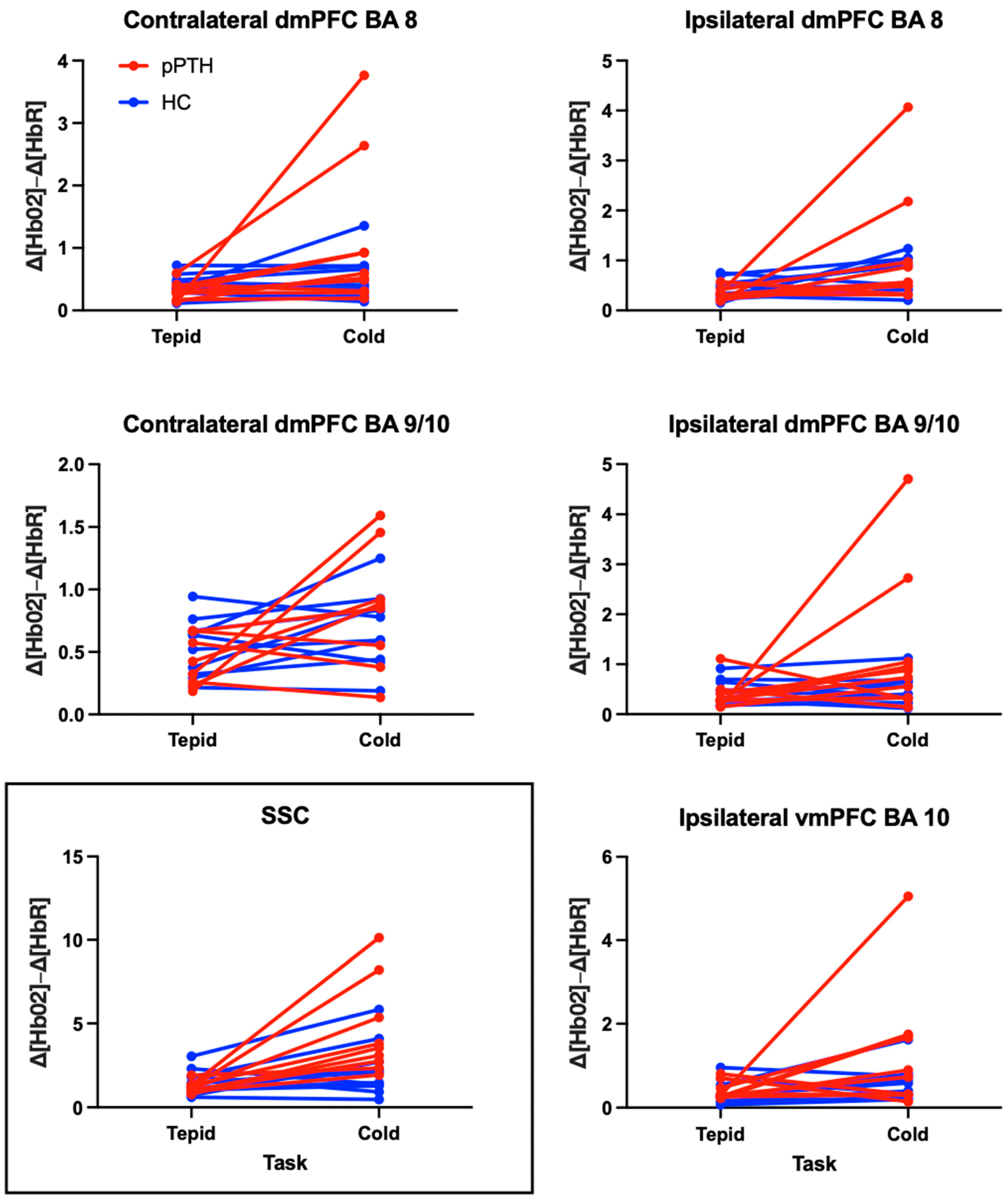 Differences in peak-to-peak hemodynamic responses for participants with persistent post-traumatic headache and healthy controls during tepid- and cold-water hand immersion. Each line reflects a single participant in the persistent post-traumatic headache (pPTH; red) or healthy control (HC; blue) groups. Plots show changes in peak-to-peak hemodynamic responses between tepid- (left column) and cold-water hand immersion (right column) prior to logarithmic adjustment for non-normality. Boxed and unboxed channels reflect extra- and intracranial hemodynamic responses, respectively. Abbreviations: BA = Brodmann’s Area; dmPFC = dorsomedial prefrontal cortex; vmPFC = ventromedial prefrontal cortex; SSC = short separation channel.