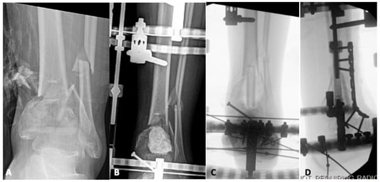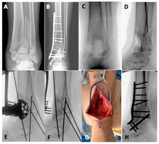 - Olson, J.J.; Anand, K.; Esposito, J.G.; von Keudell, A.G.; Rodriguez, E.K.; Smith, R.M.; Weaver, M.J. Complications and Soft-Tissue Coverage after Complete Articular, Open Tibial Plafond Fractures. J. Orthop. Trauma 2021, 35, e371–e376. [Google Scholar] [CrossRef]