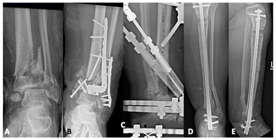- Rosteius, T.; Lotzien, S.; Königshausen, M.; Rausch, V.; Cibura, C.; Behr, B.; Lehnhardt, M.; Schildhauer, T.A.; Geßmann, J. Analysis of Bone Transport for Ankle Arthrodesis as A Limb Salvage Procedure for The Treatment of Septic Pilon Fracture Nonunion. Sci. Rep. 2021, 11, 24472. [Google Scholar] [CrossRef]