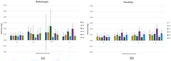 (a) WSS (Wall Shear Stress) distribution across each sector of the Ishimaru’s classification and spatial deviation for ASA vessels. (b) WSS distribution across each sector of the Ishimaru’s classification and spatial deviation for non-ASA vessels.