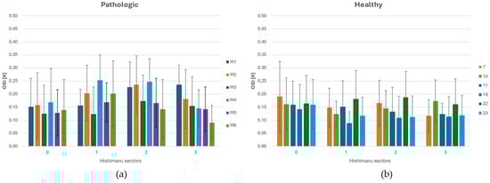 (a) OSI (Oscillatory Shear Index) distribution across each sector of Ishimaru’s classification and spatial deviation for ASA vessels. (b) OSI distribution across each sector of Ishimaru’s classification and standard deviation for non-ASA vessels.