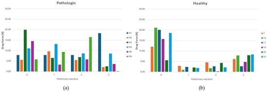 For the Ishimaru sector, DF magnitudes were extracted and compared across individuals. The aberrant cohort demonstrated marked inter-subject variability, with multiple sectors—particularly in zones 2 and 3—exhibiting consistently elevated drag forces, as shown in Figure 7a. This pattern suggests localized alterations in flow dynamics, attributable to perturbed geometry and asymmetric branching associated with the aberrant vessel.