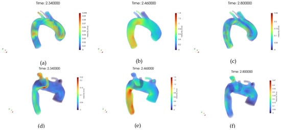 (a) Volume rendering of the velocity (U) field at early systole, case 10. (b) Volume rendering of the velocity field at peak systole, case 10. (c) Volume rendering of the velocity field at diastole, case 10. (d) Volume rendering of the velocity field at early systole, case M3. (e) Volume rendering of the velocity field at peak systole, case M3. (f) Volume rendering of the velocity field at diastole, case M3.