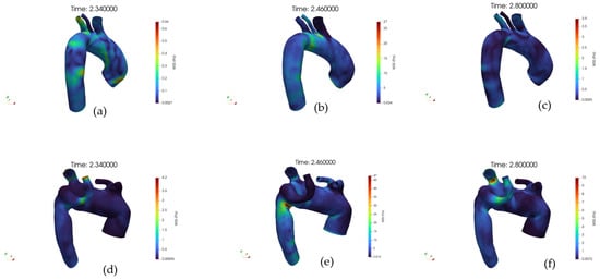 Figure 10a–f shows the WSS distribution at the wall, respectively, for the healthy and pathological anatomies. In a healthy artery, WSS shows a spatially homogeneous distribution that increases consistently from early systole to peak systole, followed by a marked reduction during diastole.