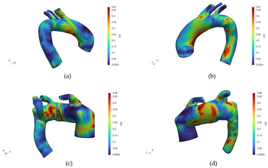 Figure 11 illustrates the spatial distribution of the OSI across the aortic surface, respectively, for healthy and pathological anatomy, each displayed from anterior and posterior perspectives. In a healthy subject, OSI values remain consistently low across most of the vessel wall, indicating a predominance of unidirectional shear stress.