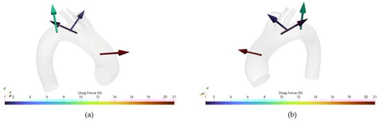 Conversely, the control anatomy yielded lower and more homogeneous DF profiles across all zones, consistent with physiologically streamlined flow, as shown in Figure 7b. Since each patient exhibits a specific DF pattern closely related to their individual aortic arch geometry, the data from different cases cannot be aggregated. However, in pathological cases, a tendency can be observed: in zone 2, the DF typically shows a posterosuperior orientation, while in zone 1, the direction of the drag force is more variable, displaying either anterosuperior or posterosuperior trajectories.
