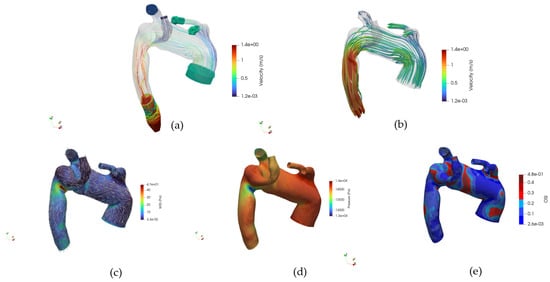Our findings underscore the importance of incorporating detailed anatomical variations into hemodynamic assessments and highlight the value of CFD as a non-invasive tool to investigate patient-specific vascular risks. Moreover, with such a study, a complete dataset for CFD simulation of the ASA is provided. CFD-ready geometries are brought to the disposal of the scientific community, together with boundary conditions and hemodynamic fields. The dataset enables the visualization and navigation of interest hemodynamic fields to extensively investigate such abnormalities in the thoracic aorta’s anatomy. The following post-processing is gathered into a Paraview state and shown in Figure 15: