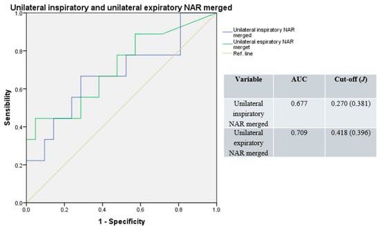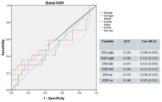 Under basal conditions, the median AUC was 0.540 (range: 0.473–0.588) for unilateral and 0.562 (range: 0.548–0.576) for total NAR values. The median cut-off was 0.518 Pa/cm3/s (range: 0.506–0.552; median J = 0.213) for unilateral and 0.273 Pa/cm3/s (range: 0.240–0.305; median J = 0.233) for total NAR values (Figure 1).