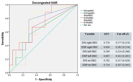 Receiver operating characteristic curves were first calculated considering unilateral and total NAR separately, both at baseline and after nasal decongestion; further curves were then built merging NAR values through binary regression.