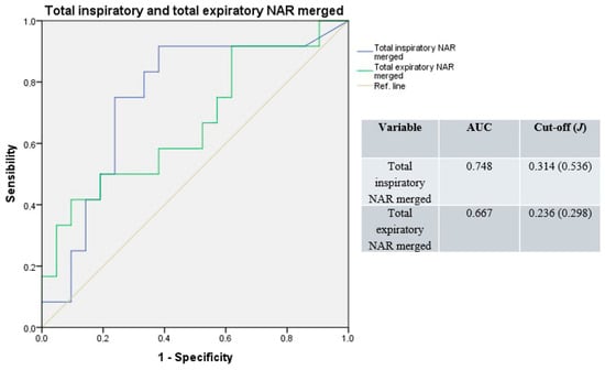 Similarly, merging basal and decongested total NAR values, the median AUC result was 0.708 (range: 0.667–0.748), with a median cut-off of 0.275 Pa/cm3/s (range: 0.236–0.314; median J = 0.417; Figure 4).