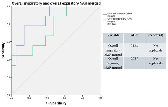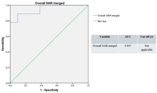 The ROC curve resulting from the whole NAR values merged produced the highest accuracy (AUC = 0.947), with a non-applicable Youden’s index (Figure 6).
