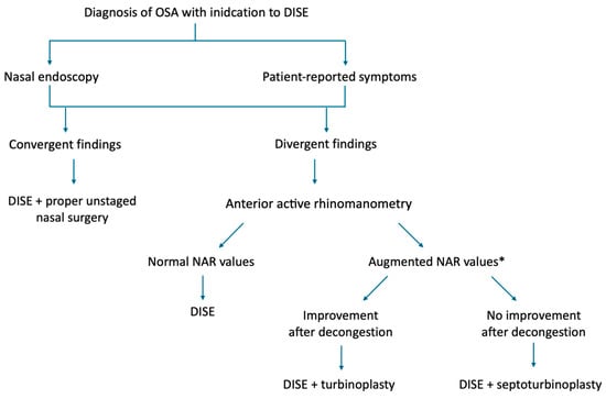 Treating nasal obstruction is not only important for symptom relief and quality-of-life improvement but also acquires additional value in the comprehensive management of OSA patients. In the setting of DISE, where the upper airway is already being functionally assessed under sedation, combining tailored nasal surgery with diagnostic evaluation may streamline care and reduce the need for staged interventions. However, to maximize effectiveness, nasal surgery should be individualized rather than performed according to standardized algorithms. To date, the evaluation of nasal obstruction in OSA remains largely clinical. Nasal endoscopy and high-resolution CT have improved anatomical assessment, but validated methods for functional airflow evaluation are not yet routinely applied in practice. Objective functional assessment tools such as AAR, especially when performed both before and after decongestion, may provide useful data to distinguish structural from mucosal obstruction and guide the surgical strategy during DISE [25].