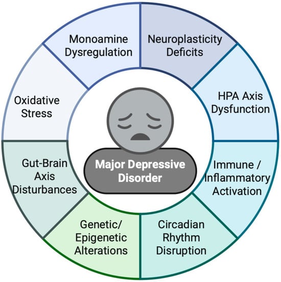 Major Depressive Disorder (MDD) is a complex and multifactorial psychiatric condition, the pathogenesis of which extends beyond simplistic explanations to encompass a sophisticated interplay of physiological, biochemical, genetic, and molecular mechanisms (Figure 1) [32]. Recent advancements in neuroscience have elucidated several key pathways and hypotheses that collectively contribute to our evolving understanding of this debilitating disorder.