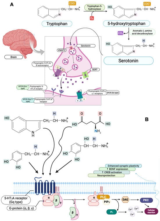 Serotonin biosynthesis and Gq-coupled signaling cascades implicated in Major Depressive Disorder (MDD). (A) Serotonin biosynthesis and synaptic transmission: tryptophan, an essential amino acid, is converted to 5-hydroxytryptophan (5-HTP) by tryptophan-5-hydroxylase (TPH) and further decarboxylated by aromatic L-amino acid decarboxylase (AADC) to yield serotonin (5-hydroxytryptamine, 5-HT). Newly synthesized 5-HT is stored in presynaptic vesicles via the vesicular monoamine transporter 2 (VMAT2) and released into the synaptic cleft. Serotonin modulates neurotransmission by binding to multiple receptor subtypes: presynaptic 5-HT1A/B autoreceptors (negative feedback on release) and postsynaptic Gi/0-, Gq/11-, and Gs-coupled receptors (e.g., 5-HT1A, 5-HT2A, 5-HT4/6/7). Clearance of 5-HT from the synaptic cleft occurs through the serotonin transporter (SERT); dysregulation of this synthesis-release-reuptake axis contributes to serotonergic deficiency and impaired mood regulation observed in MDD. (B) Post-synaptic Gq-coupled 5-HT2A signaling and neuroplastic outcomes: activation of Gq-coupled 5-HT2A receptors (by initiates a signaling cascade through G-protein (Gα(q), Gβ, Gγ) activation of phospholipase C-β (PLC(β)), which hydrolyses phosphatidylinositol-4,5-bisphosphate (PIP2) into diacylglycerol (DAG) and inositol-1,4,5-trisphosphate (IP3). IP3 stimulates Ca2+ release from endoplasmic reticulum stores via IP3 receptors (IP3R), while DAG and Ca2+ jointly activate protein kinase C (PKC). The rise in intracellular Ca2+ also activates calmodulin (CaM) and Ca2+/calmodulin-dependent kinase II (CaMK-II). Both PKC and CaMKII converge on the ERK1/2 (MAPK) pathway, promoting phosphorylation of CREB (cAMP-response element-binding protein) and subsequent transcription of BDNF (brain-derived neurotrophic factor). This pathway enhances synaptic plasticity, neuroprotection, and resilience, mechanisms often compromised in MDD and restored by antidepressant therapy.