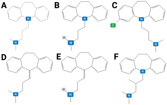 Chemical structures of representative tricyclic antidepressants (TCAs) used in the treatment of major depressive disorder (MDD): (A) imipramine (IUPAC name: 3-(5,6-dihydrobenzo[b][1]benzazepin-11-yl)-N,N-dimethylpropan-1-amine), (B) desipramine (IUPAC name: 3-(5,6-dihydrobenzo[b][1]benzazepin-11-yl)-N-methylpropan-1-amine), (C) clomipramine (IUPAC name: 3-(2-chloro-5,6-dihydrobenzo[b][1]benzazepin-11-yl)-N,N-dimethylpropan-1-amine), (D) amitriptyline (IUPAC name: N,N-dimethyl-3-(2-tricyclo[9.4.0.03,8]pentadeca-1(15),3,5,7,11,13-hexaenylidene)propan-1-amine), (E) nortriptyline (IUPAC name: N-methyl-3-(2-tricyclo[9.4.0.03,8]pentadeca-1(15),3,5,7,11,13-hexaenylidene)propan-1-amine), (F) trimipramine (IUPAC name: 3-(5,6-dihydrobenzo[b][1]benzazepin-11-yl)-N,N,2-trimethylpropan-1-amine).
