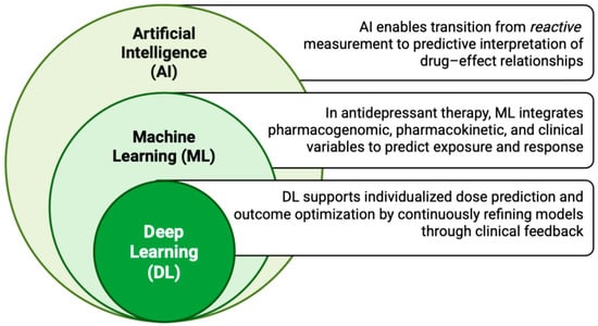 Conceptual framework for integrating artificial intelligence (AI), machine learning (ML), and deep learning (DL) into predictive therapeutic drug monitoring (TDM) for antidepressants.