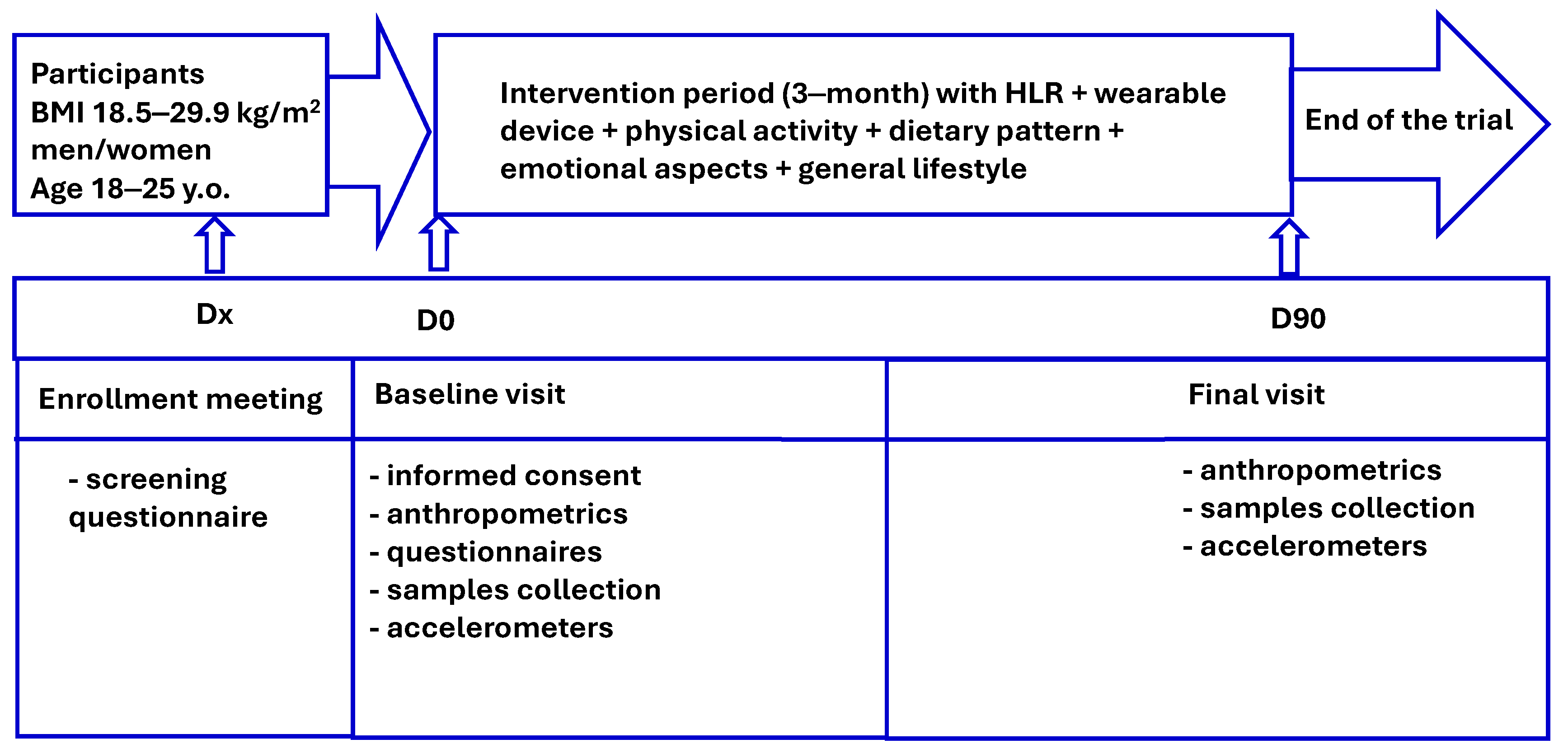 - Enrollment visit (Dx): Informed consent (after receiving written and verbal information about the study’s objectives, risks, and benefits), eligibility assessment (assessed based on anthropometric measurements, and screening questionnaires on general health and lifestyle), and meeting inclusion criteria.
