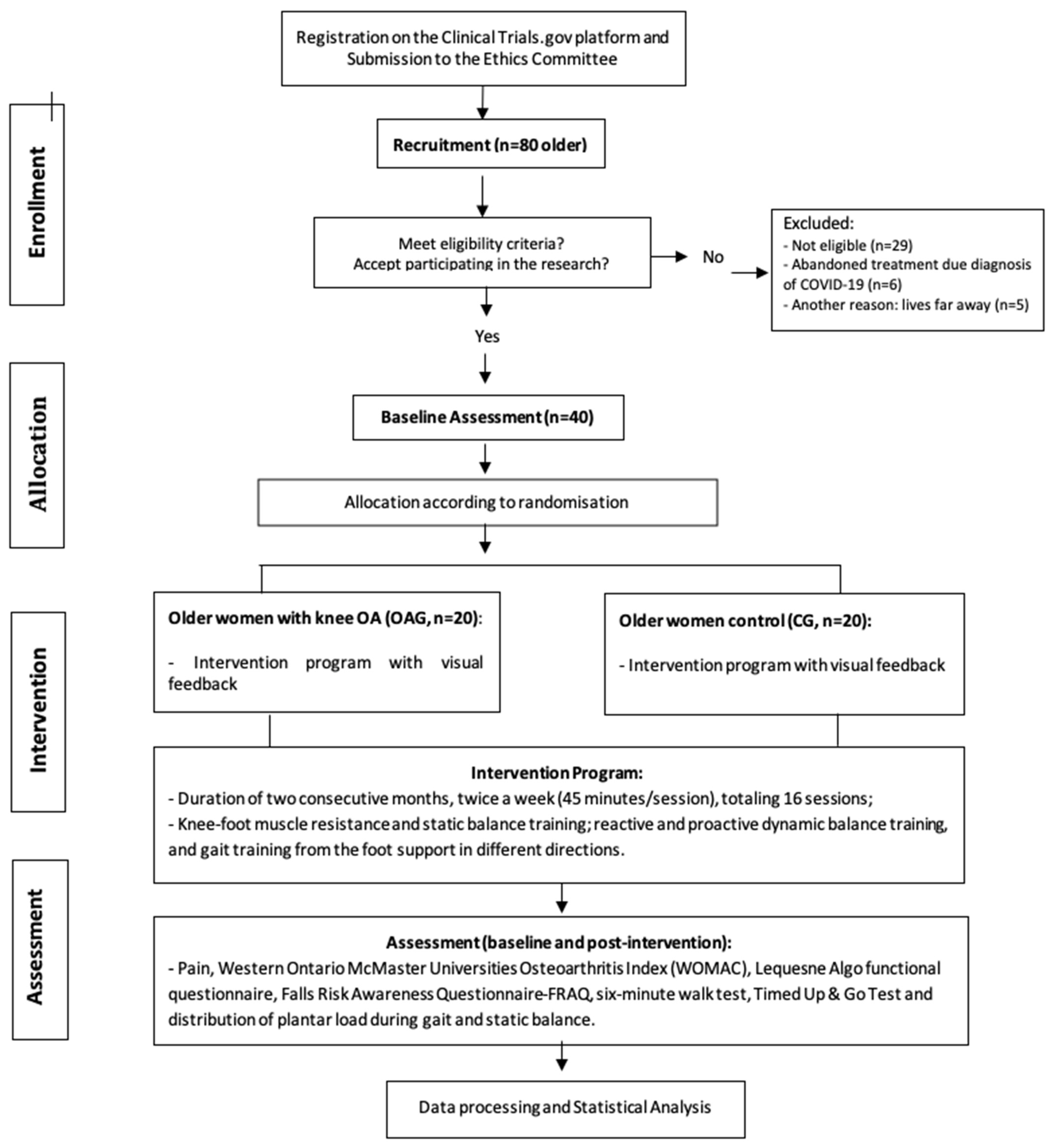 - Pereira, D.B.; Souza, T.S.; Fuzinato, C.T.; Hagihara, R.J.; Ribeiro, A.P. Effect of a programme of muscular endurance, balance and gait exercises with and without the use of flexible and minimalist shoes in older women with medial knee osteoarthritis: Study protocol for a randomised controlled trial. BMJ Open 2022, 12, e061267. [Google Scholar] [CrossRef]