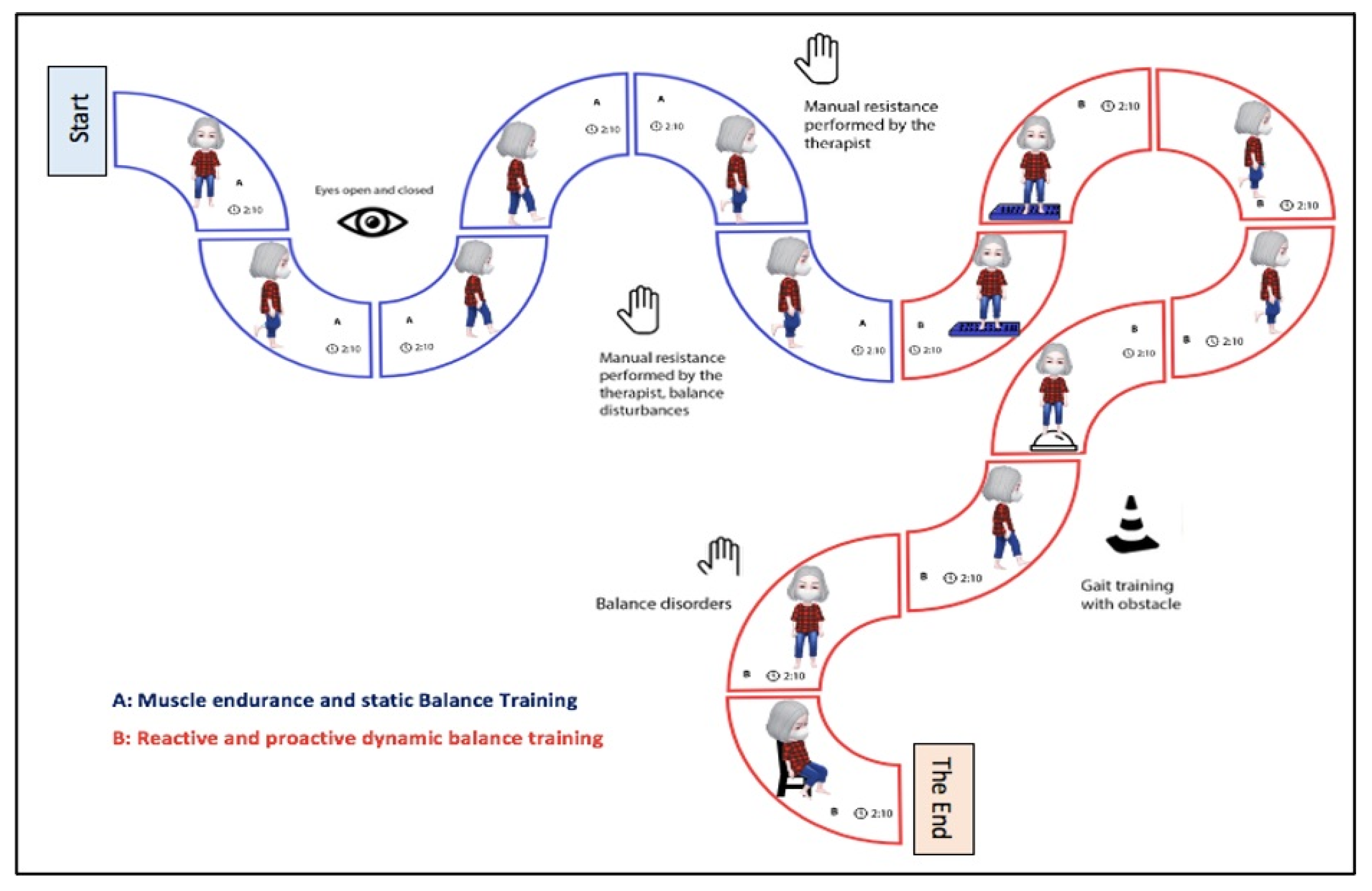 | Balance training with motor exercise | Walk with obstacles | Normal; Tandem; Lateral |