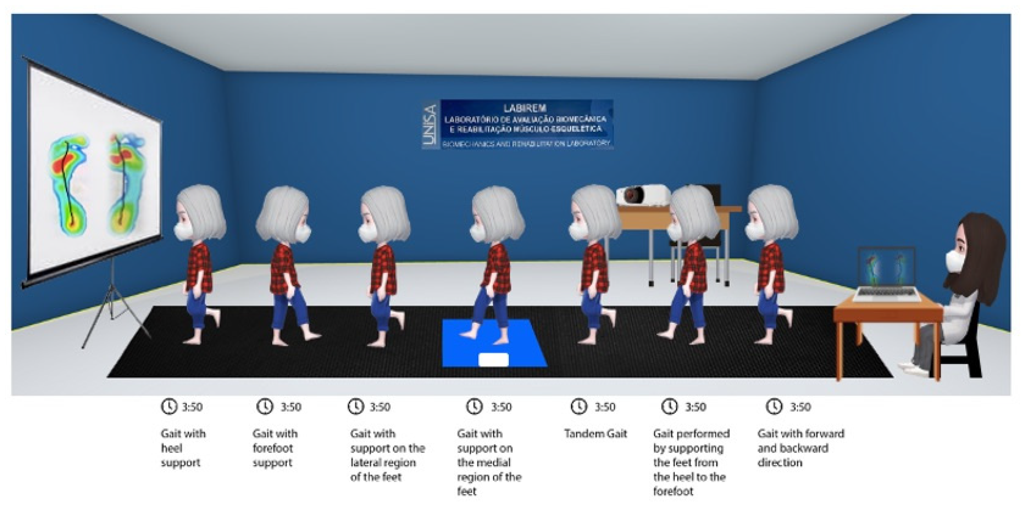 | Gait with support and displacement | Heel; forefoot; side edge; Medial Edge; Tandem; Displacement from heel to forefoot; Forward and backward direction (Figure 3) | |