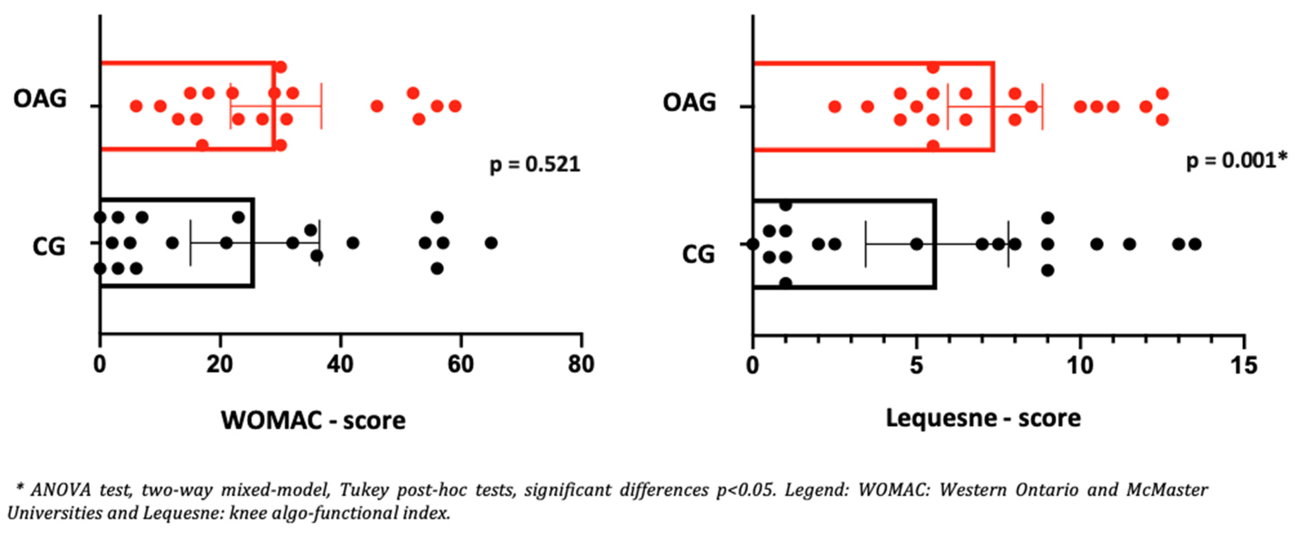| Clinical Variables | OAG Knee (n = 20) | CG (n = 20) | ||||||