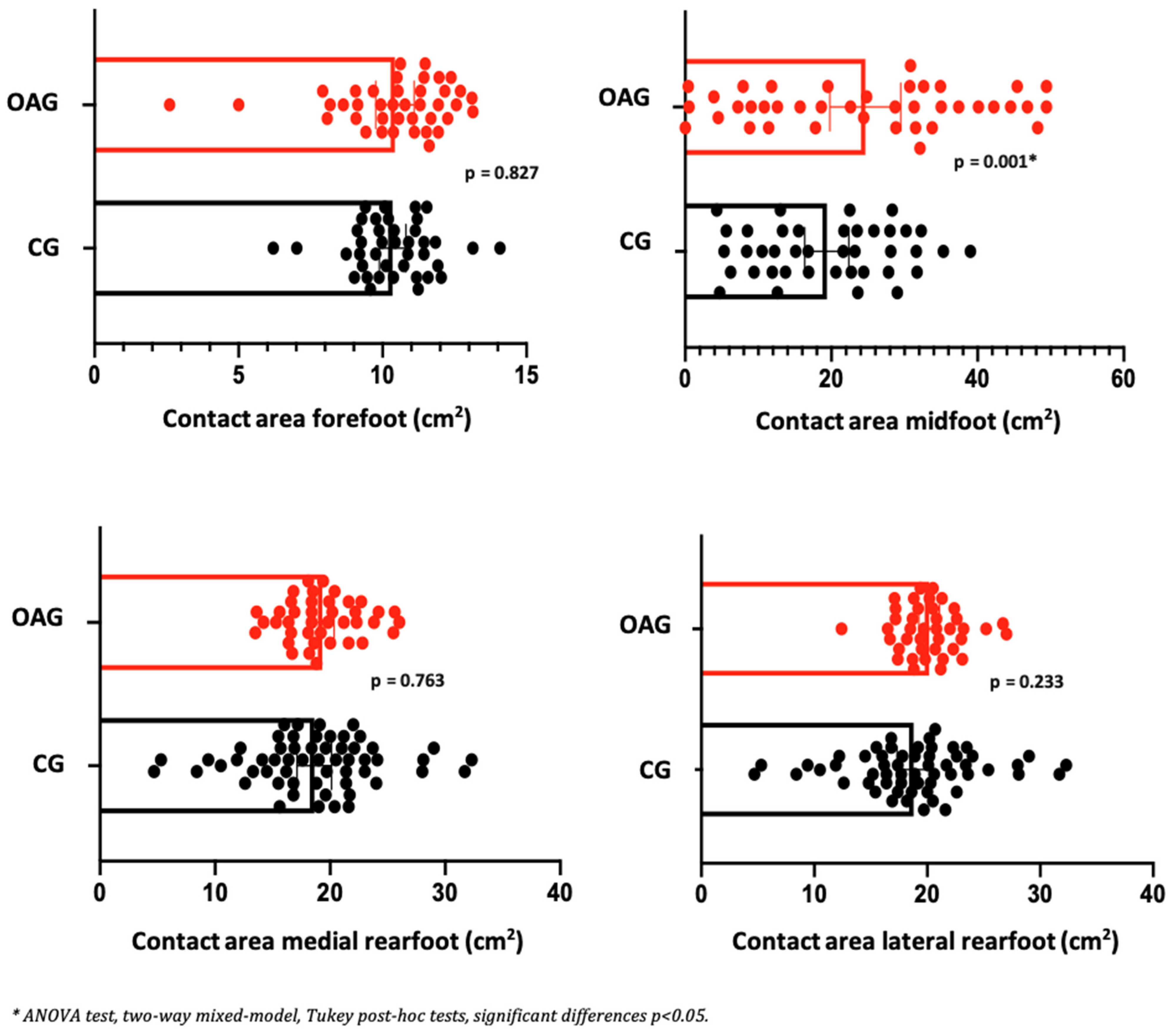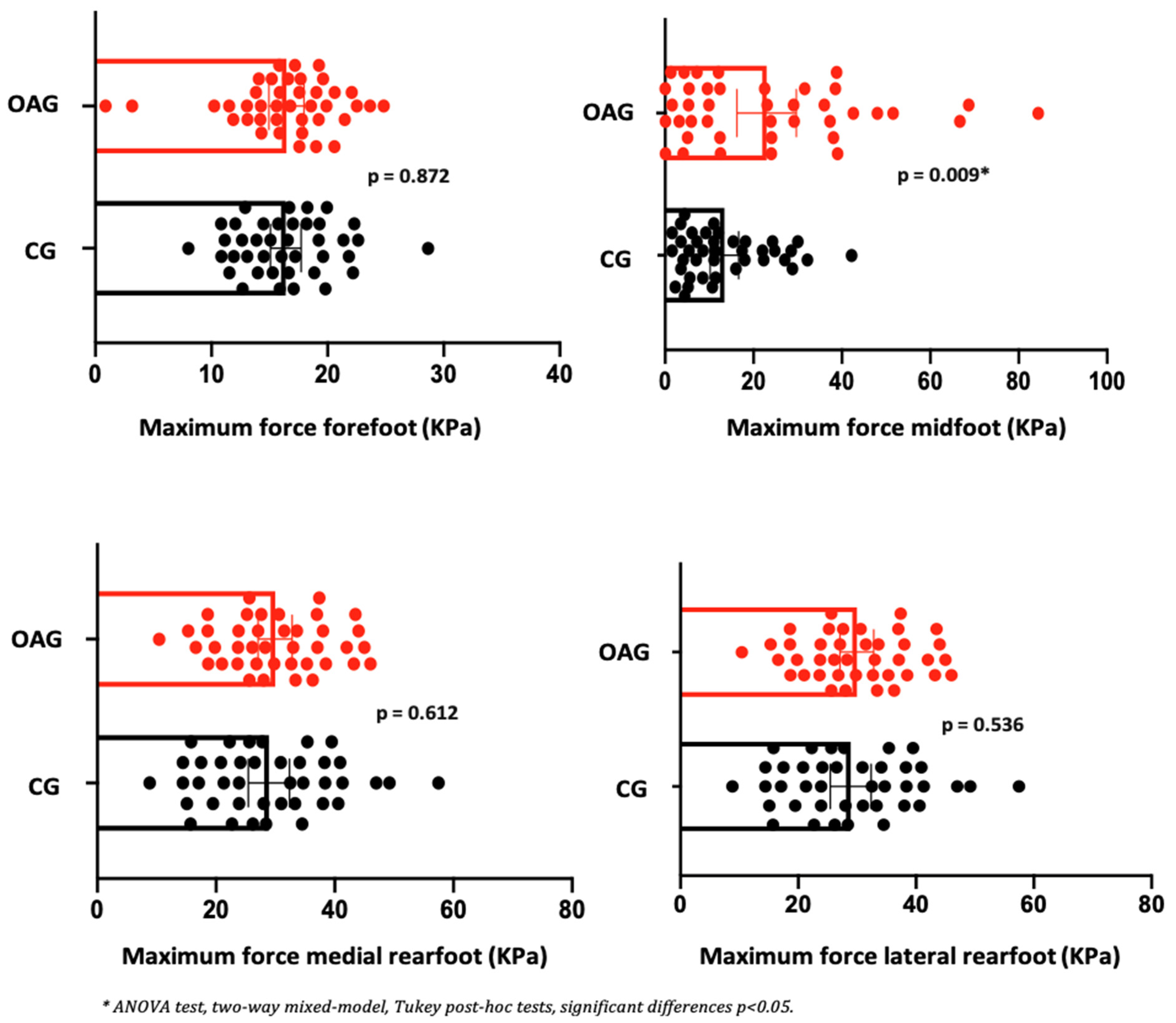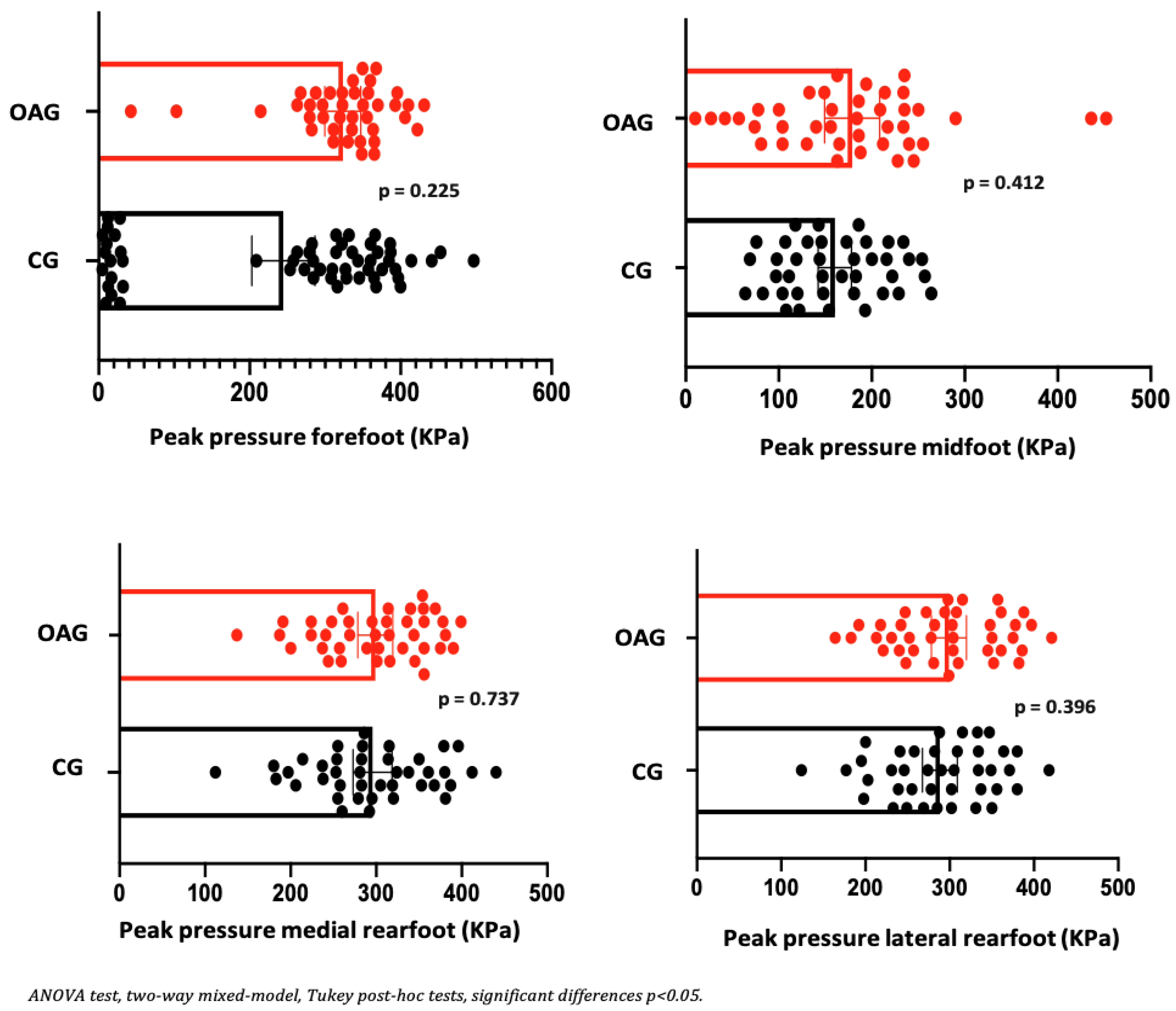 | Biomechanics Variables | Foot Regions | OAG Knee (n = 20) | CG (n = 20) | ||||||
