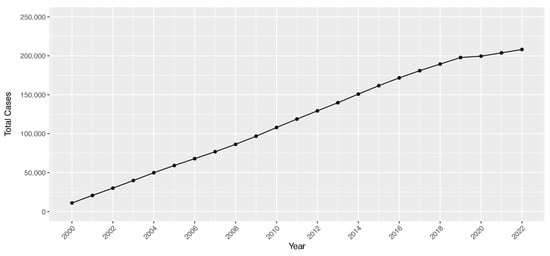 Total strabismus cases among Veterans in the Veterans Health Administration population annually, 2000–2022.
