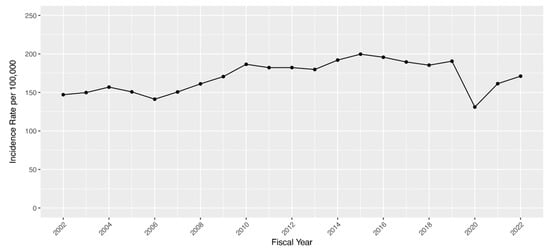 New strabismus cases per 100,000 Veteran enrollees in the Veterans Health Administration, 1 October 2002 to 30 September 2022.