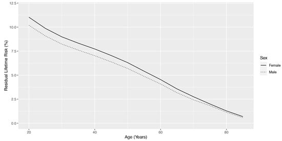 Residual lifetime risk of strabismus diagnosis by age for male and female Veterans enrolled in the Veterans Health Administration.