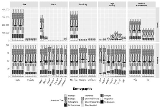 There were significant relationships between the distribution of strabismus types and age group, sex, race, ethnicity, and a history of service-connected disability (p < 0.001 for all demographics). The differences in strabismus types by sex remained significant after adjusting for age, and the differences by race, ethnicity, and history of service connection remained significant after adjusting for age and sex. The number of patients with each strabismus type for each demographic, as well as the percent of diagnoses for each strabismus type within these demographics, are shown in Figure 4.