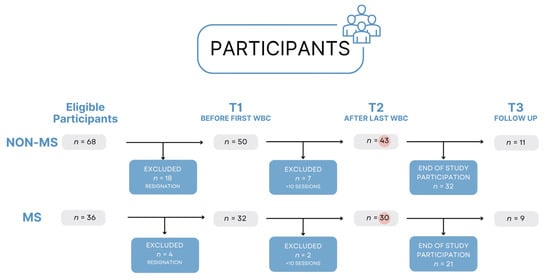 Participants flowchart. The orange circles indicate the number of participants who were assessed after completing 10 WBC sessions.