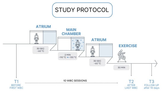 Participants underwent a series of 10 consecutive WBC sessions, excluding weekends. The cryotherapy process took place in a specialized chamber with two sections. The procedure involved an initial adaptation phase of 30 s in an atrium at −60 °C, followed by 2 min in the main chamber. The temperature in the main chamber started at −120 °C on the first day and decreased by 2 °C every other day, reaching −130 °C by the last session. After the main chamber exposure, participants returned to the atrium for an additional 30 s. The whole procedure lasted for 3 min. The chamber was cooled using liquid nitrogen. To ensure safety, participants wore protective gear: gloves, knee-high socks, wooden clogs, a headband or hat for ear coverage, and a surgical mask. Each session was immediately followed by a 30 min supervised exercise routine, primarily on a cycle ergometer, to promote rewarming and enhance therapeutic benefits (Figure 2).