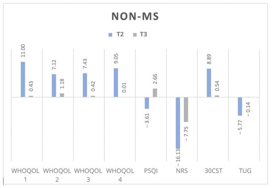 Percentage of change in the results of every test in non-MS participants. Abbreviations: WHOQOL: The World Health Organization Quality of Life-BREF; PSQI: Pittsburgh Sleep Quality Index; NRS: Numerical Rating Scale; 30CST: 30-Second Chair Stand Test; TUG: Timed Up and Go. T2: after last WBC; T3: at follow-up.
