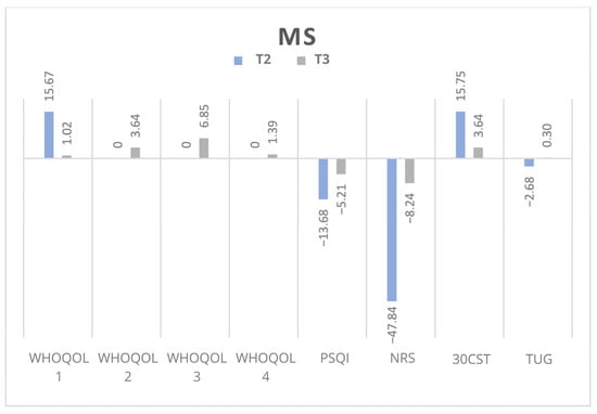 Percentage of change in the results of every test in MS participants. Abbreviations: WHOQOL: The World Health Organization Quality of Life-BREF; PSQI: Pittsburgh Sleep Quality Index; NRS: Numerical Rating Scale; 30CST: 30-Second Chair Stand Test; TUG: Timed Up and Go. T2: after last WBC; T3: at follow-up.