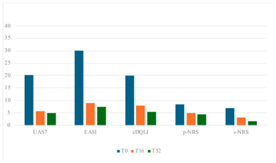 Among the 17 patients with moderate-to-severe AD, 58.8% were female, with a mean age of 14.6 years (±2.49 SD). Treatment with dupilumab resulted in a reduction in the mean EASI score by 70.3% at 16 weeks and 75.3% at 52 weeks compared to baseline. Furthermore, a significant decrease was observed in subjective symptoms, with the p-NRS score reduced by 40% and the s-NRS score by 52.9% (p < 0.001). DLQI/c-DLQI score demonstrated a significant decrease from the baseline value to the end of treatment (p < 0.001), with a mean percentage reduction from baseline to 52w of 72.6%. (Table 3; Figure 1). No dose adjustments occurred during the whole study period.