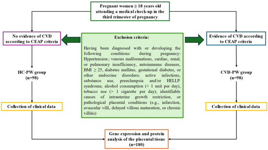 Exclusion criteria encompassed individuals with prior diagnoses of hypertension, venous malformations, cardiac, renal, or pulmonary insufficiency, autoimmune diseases, a body mass index (BMI) ≥ 25, diabetes mellitus, gestational diabetes, or other endocrine disorders. Additionally, individuals with active infections, substance use (e.g., cannabis, heroin, cocaine, or amphetamines), preeclampsia and/or HELLP syndrome, alcohol consumption exceeding one unit per day, tobacco use of more than one cigarette per day, identifiable causes of intrauterine growth restriction, or pathological placental conditions (e.g., infarction, avascular villi, delayed villous maturation, or chronic villitis) were excluded. Cases that developed any exclusion criteria during the study period were also omitted. A diagram summarizing the methods used for recruitment and group stratification is presented in Figure 1.