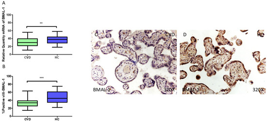 (A) Bmal1 mRNA expression levels in pregnant females who were diagnosed with CVD compared to HC group (** p < 0.01). (B) IRS scores assessing Bmal1 expression in placental tissue of women with CVD and without this condition (*** p < 0.0001). (C,D) Representative immunostaining images displaying Bmal1 expression in placental villi from CVD and HC samples.