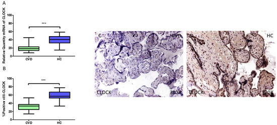 (A) CLOCK mRNA expression levels in pregnant females who were diagnosed with CVD compared to HC group (*** p < 0.0001). (B) IRS scores assessing CLOCK expression in placental tissue of women with CVD and without this condition (*** p < 0.0001). (C,D) Representative immunostaining images displaying CLOCK expression in placental villi from CVD and HC samples.