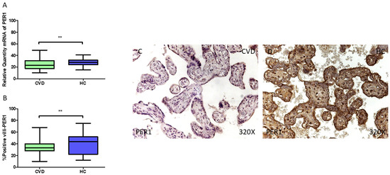 (A) PER1 mRNA expression levels in pregnant females who were diagnosed with CVD compared to HC group (** p < 0.01). (B) IRS scores assessing PER1 expression in placental tissue of women with CVD and without this condition (** p < 0.01). (C,D) Representative immunostaining images displaying PER1 expression in placental villi from CVD and HC samples.