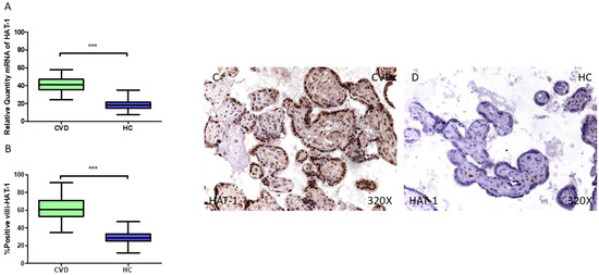 In parallel, our findings do support a significant rise in HAT1 gene expression in the placentas of the CVD-PW (*** p < 0.001; CVD = 41.036 [24.013–58.062], HC = 18.090 [7.300–35.055], Figure 6A). The histological analysis of the placental villi revealed a significant rise in Hat1 protein expression (%) in the chorionic villi of women with CVD (*** p < 0.001; CVD = 61.000 [35.000–91.000], HC = 28.500 [12.000–47.000], Figure 6B). Hat1 tissue expression was notably increased in all the placental villi of women affected by CVD compared to the HC, especially within the syncytiotrophoblast layer (Figure 6C,D).