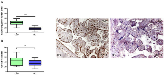 (A) H3 mRNA expression levels in pregnant females who were diagnosed with CVD compared to HC group (*** p < 0.0001). (B) IRS scores assessing H3 expression in placental tissue of women with CVD and without this condition (** p < 0.01). (C,D) Representative immunostaining images displaying H3 expression in placental villi from CVD and HC samples.