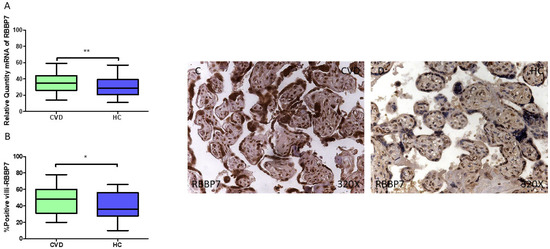 Finally, we observed a notable upregulation in RBBP7 gene expression (RT-qPCR) in the placental tissue of pregnant women with CVD (** p = 0.0035; CVD = 35.032 [14.065–59.066], HC = 28.827 [11.007–57.006], Figure 10A). The histopathological analysis of the placental villi indicated a significant rise in RBBP7 protein expression (%) within the chorionic villi of women affected by CVD (* p = 0.0253; CVD = 48.000 [20.000–78.000], HC = 36.000 [10.000–66.000], Figure 10B). RBBP7 protein levels were markedly higher in all the placental villi of women with CVD, especially in the syncytiotrophoblasts, with a comparable distribution also noted in the inner regions of the placental villi (Figure 10C,D).